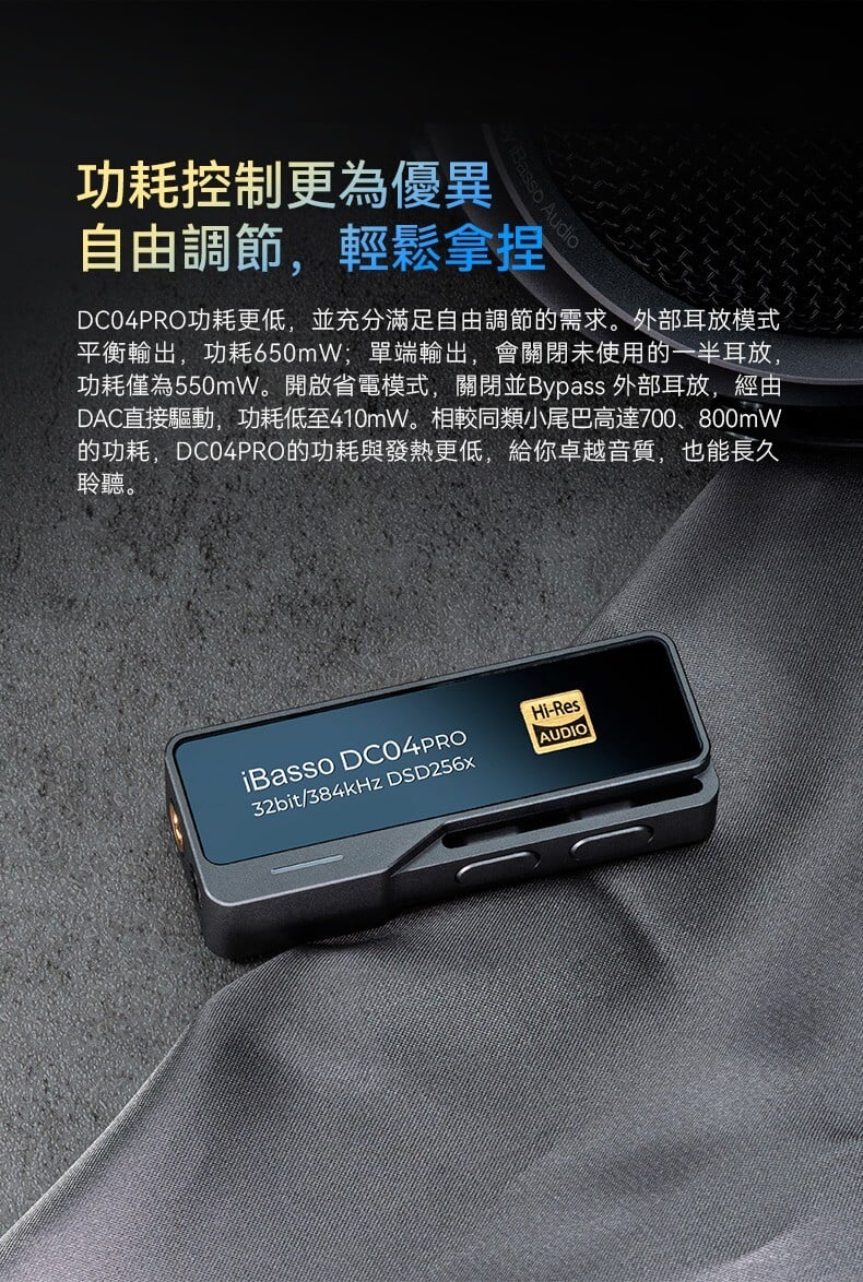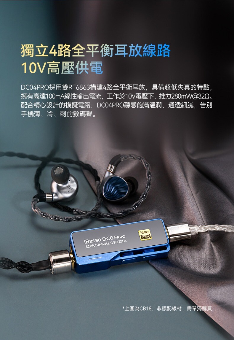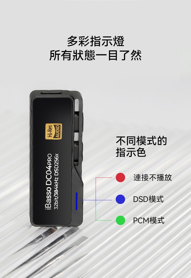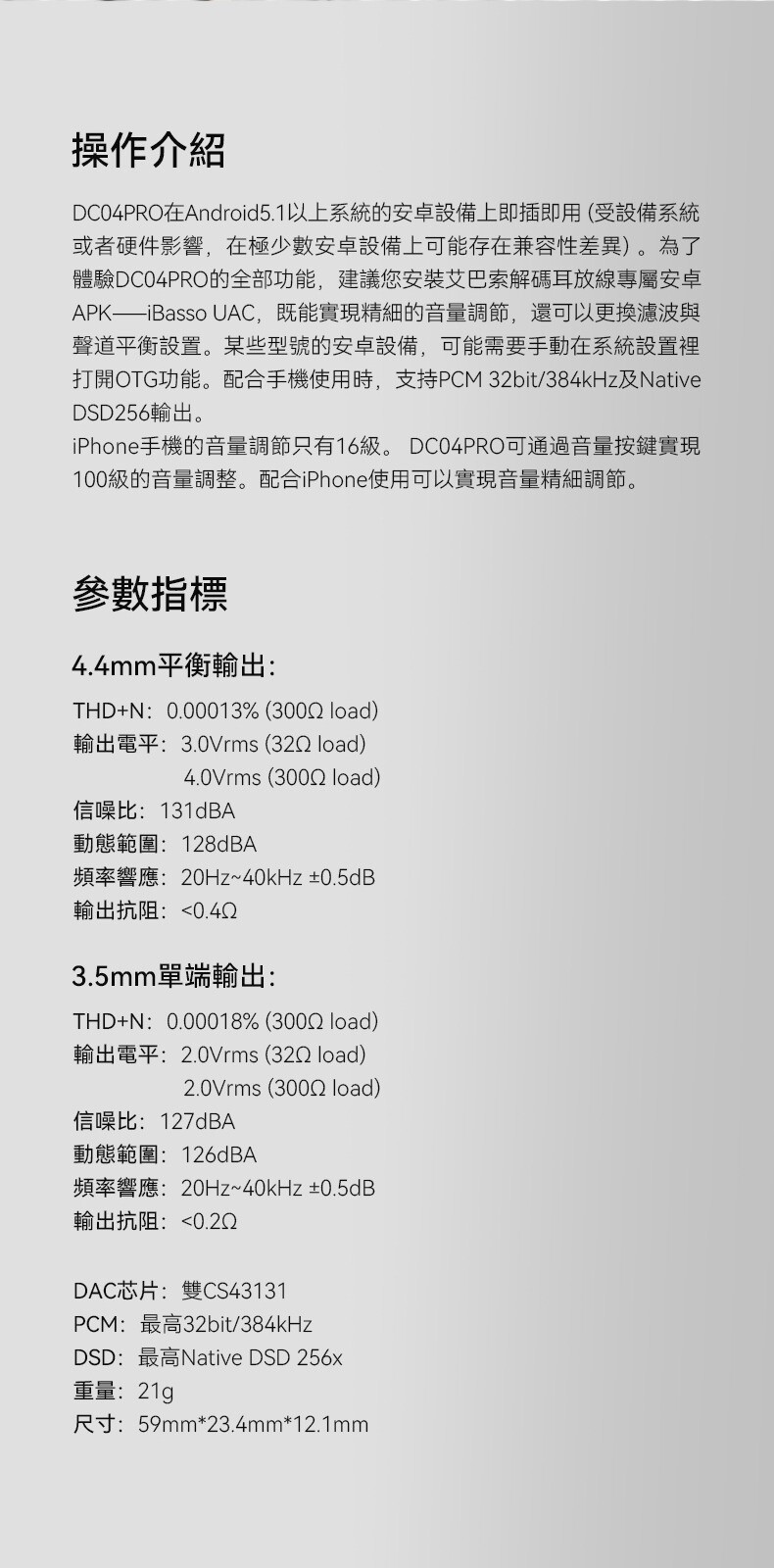 * DC04PRO 在 Android5.1 以上系統的安卓設備上隨插即用(受設備系統或者硬體影響,在極少數安卓設備上可能存在相容性差異)。為了體驗 DC04PRO 的全部功能,建議您安裝 iBasso 解碼耳放線專屬安卓APK - iBasso UAC,既能實現精細的音量調節,還可以更換濾波與聲道平衡設置。某些型號的安卓設備,可能需要手動在系統設置裡打開 OTG 功能。配合手機使用時,支持 PCM 32bit / 384kHz 及 Native DSD256 輸出。