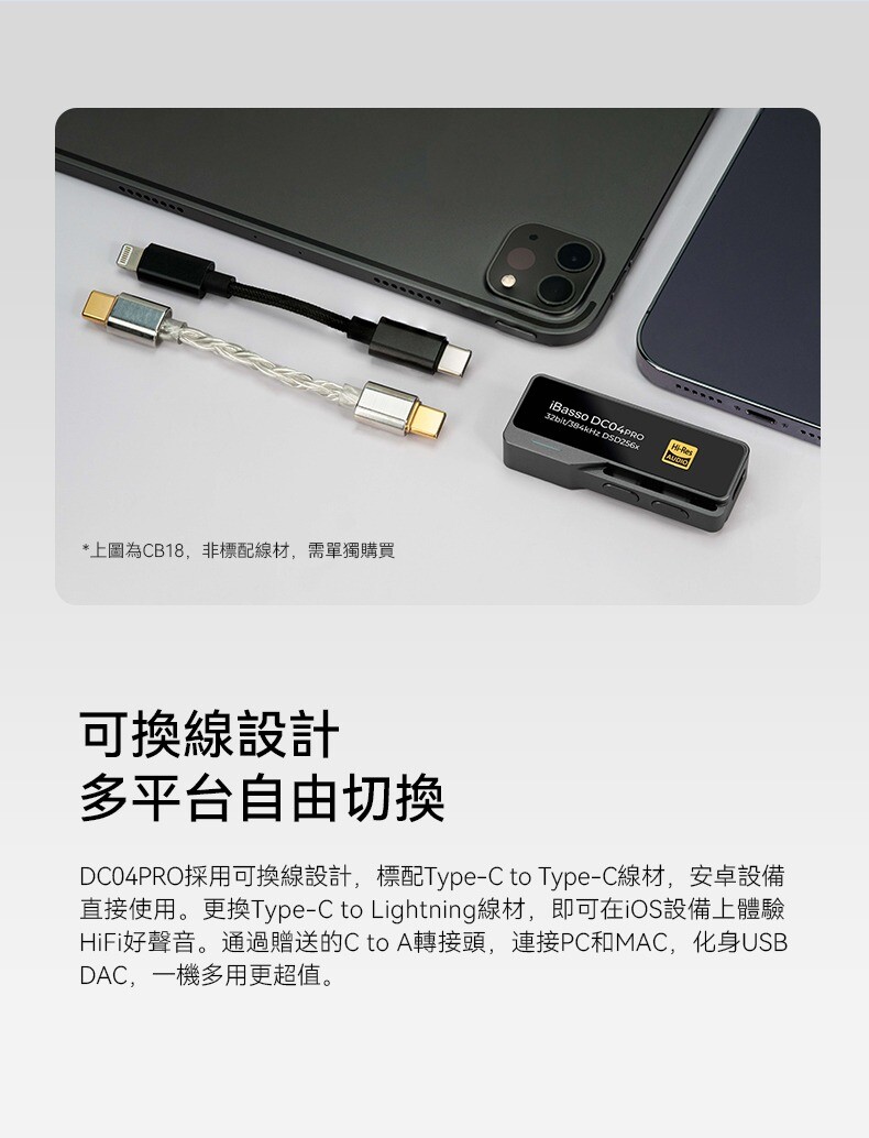 DC04PRO 採用可換線設計,標配 Type-C to Type-C 線材,安卓設備直接使用。更換 Type-C to Lightning 線材,即可在 iOS 設備上體驗 HiFi 好聲音。通過贈送的 C to A 轉接頭,連接 PC 和 MAC,化身 USB DAC,一機多用更超值。
