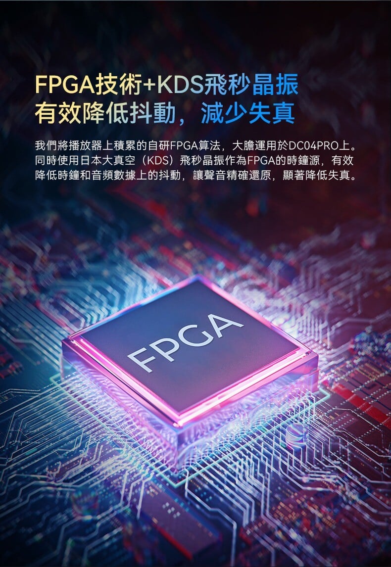 我們將播放機上積累的自研 FPGA 演算法,大膽運用於 DC04PRO 上。同時使用日本大真空(KDS)飛秒晶振作為 FPGA 的時鐘源,有效降低時鐘和音訊資料上的抖動,讓聲音精確還原,顯著降低失真。