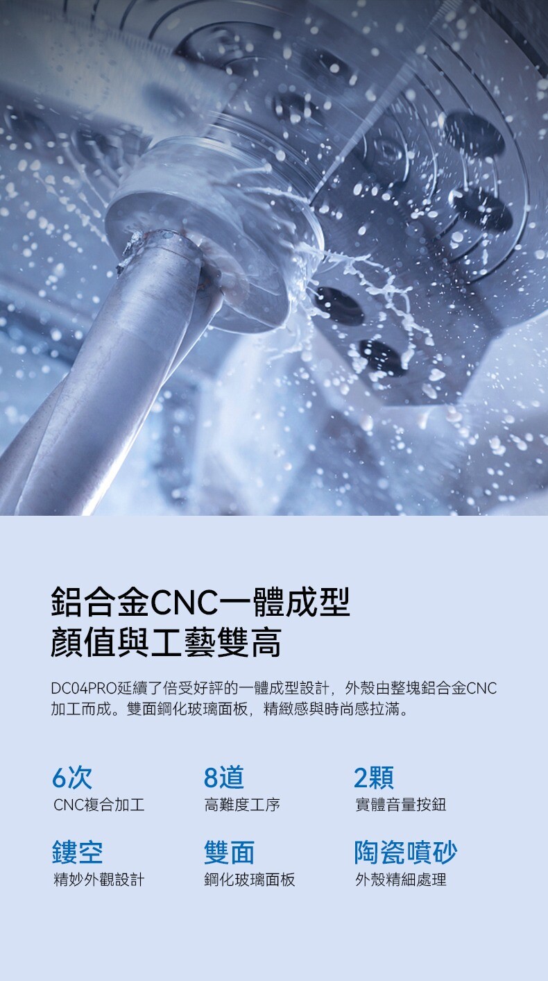 DC04PRO 延續了倍受好評的一體成型設計,外殼由整塊鋁合金 CNC 加工而成。雙面鋼化玻璃面板,精緻感與時尚感拉滿。