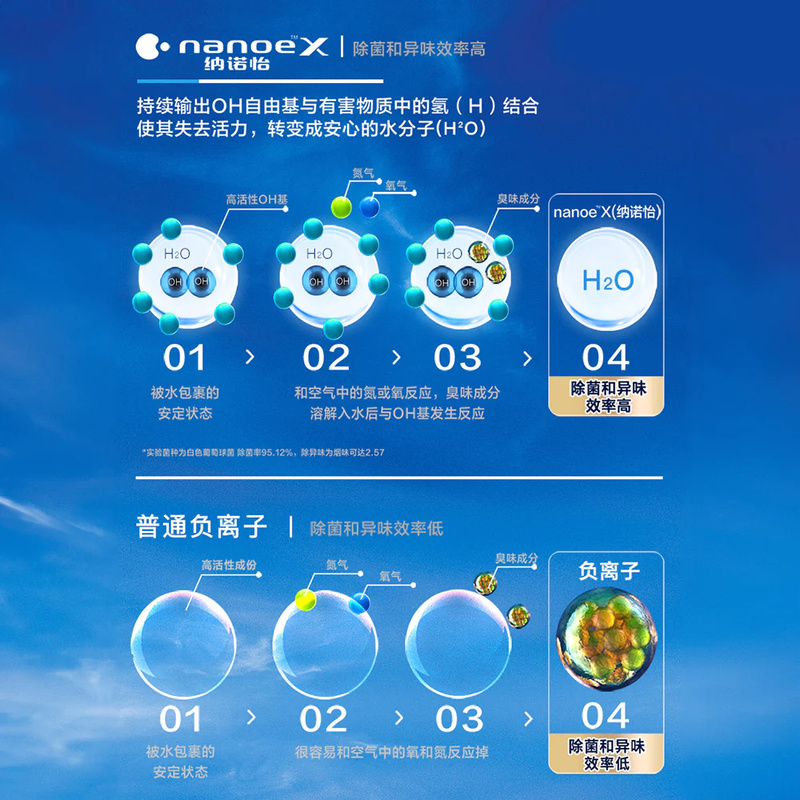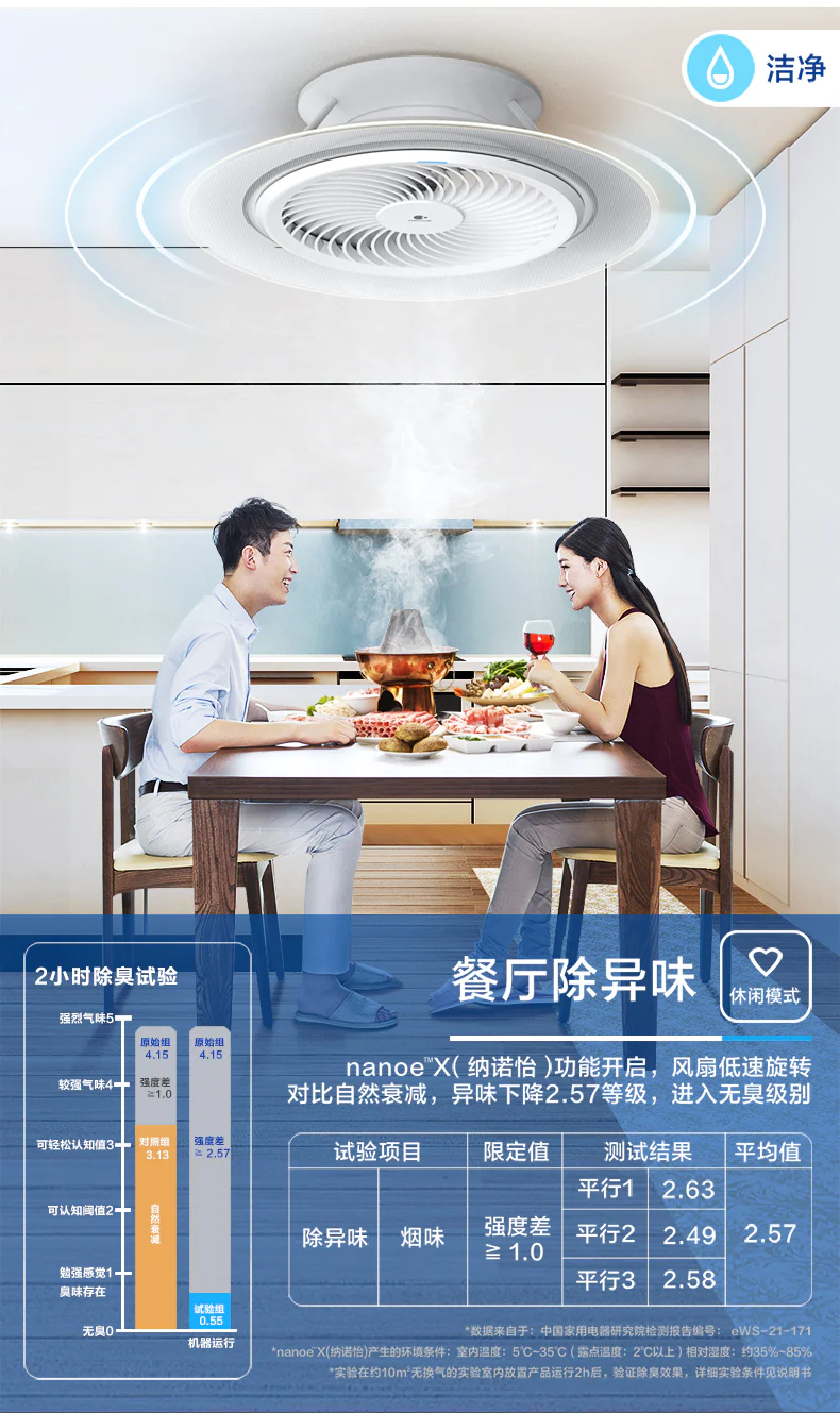 nanoe™X (納諾怡) 功能開啟,風扇低速旋轉。對比自然衰減,異味下降 2.57 等級,進入無臭級別。
