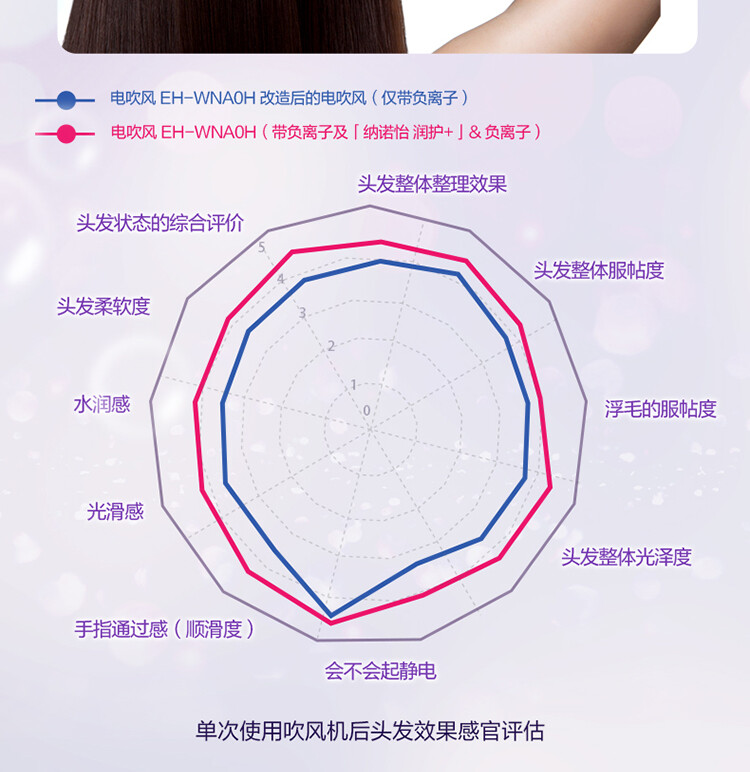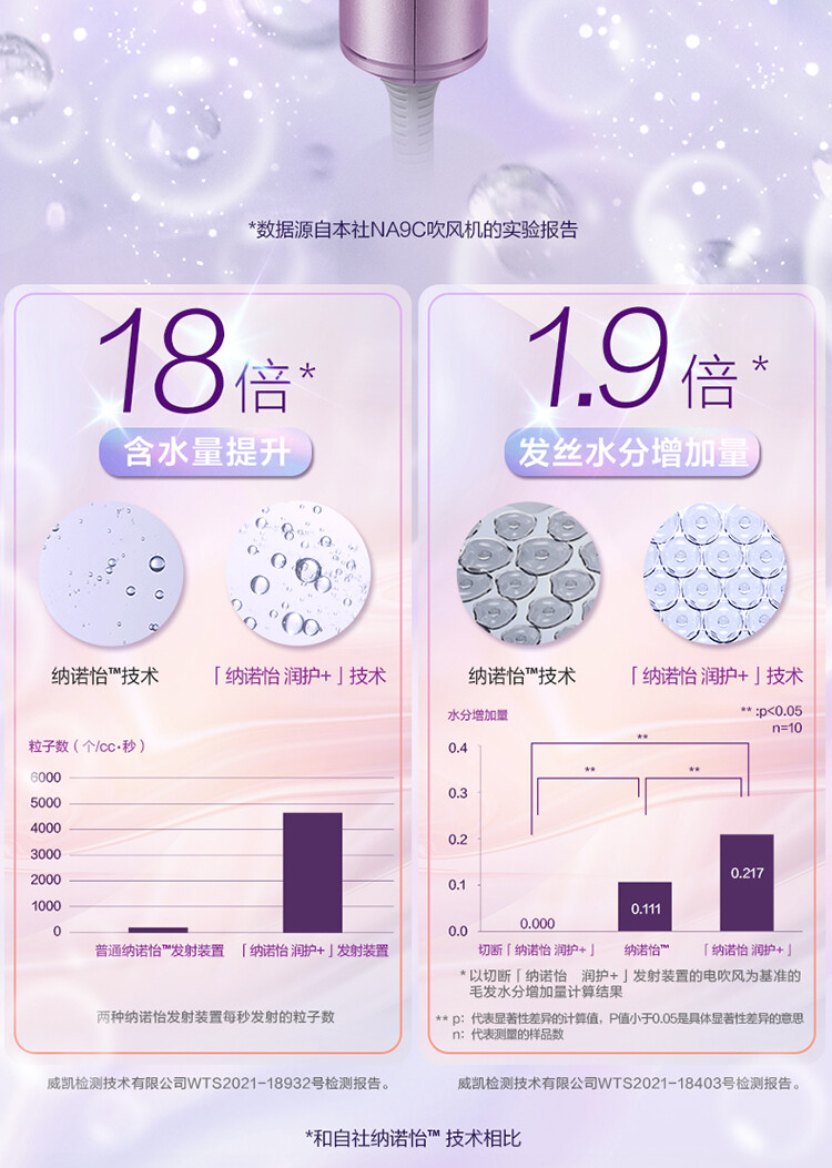 普通納諾怡™的含水量(體積比)約是負離子的1000倍。而升級版「納諾怡潤護+」作為日本2021 年研發的護髮黑科技,含水量大幅提升至普通納諾怡™ 的18 倍,使用後髮絲水分增加量達1.9 倍,深度潤護秀髮,帶來更加水潤順滑的護髮體驗。