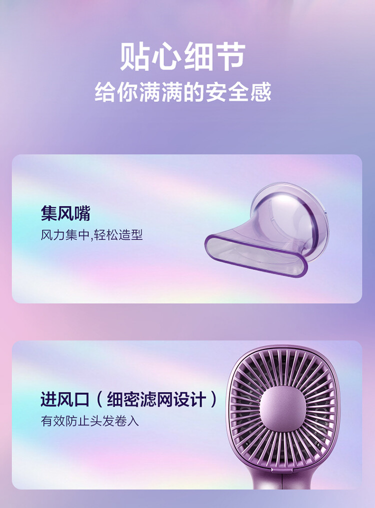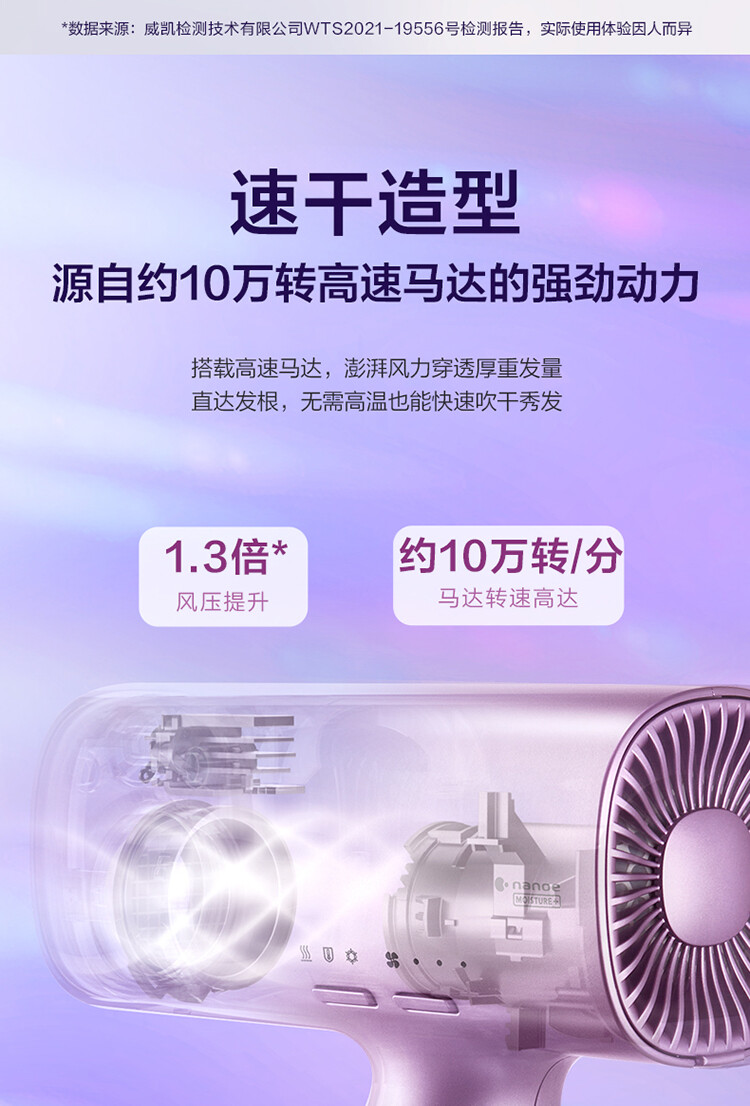 搭載約10萬轉/分高速馬達,澎無風力穿透厚重髮量。風壓提升1.3倍,直達髮根,無需高溫也能快速吹乾秀髮。