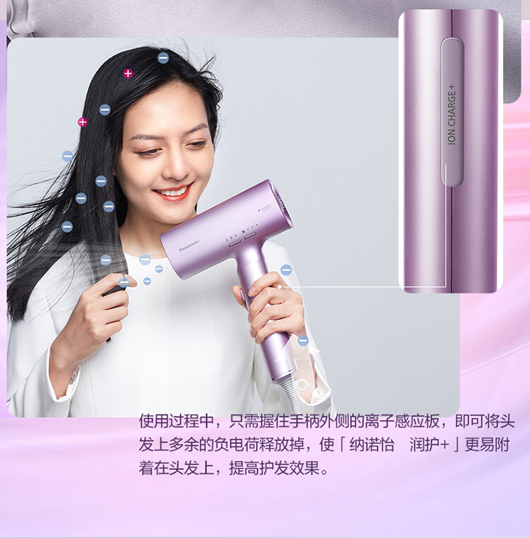 使用過程中,只需握住手柄外側的離子感應板,即可將頭髮上多餘的負電荷釋放掉,使「納諾怡 潤護+」更易附著在頭髮上,提高護髮效果。