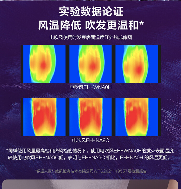 同樣使用風量最高檔和熱風檔的情況下,使用 EH-WNA0H 的髮束表面溫度較使用電吹風 EH-NA9C 低,,表明與 EH-NA9C 相比,EH-NA0H 的風溫更低。