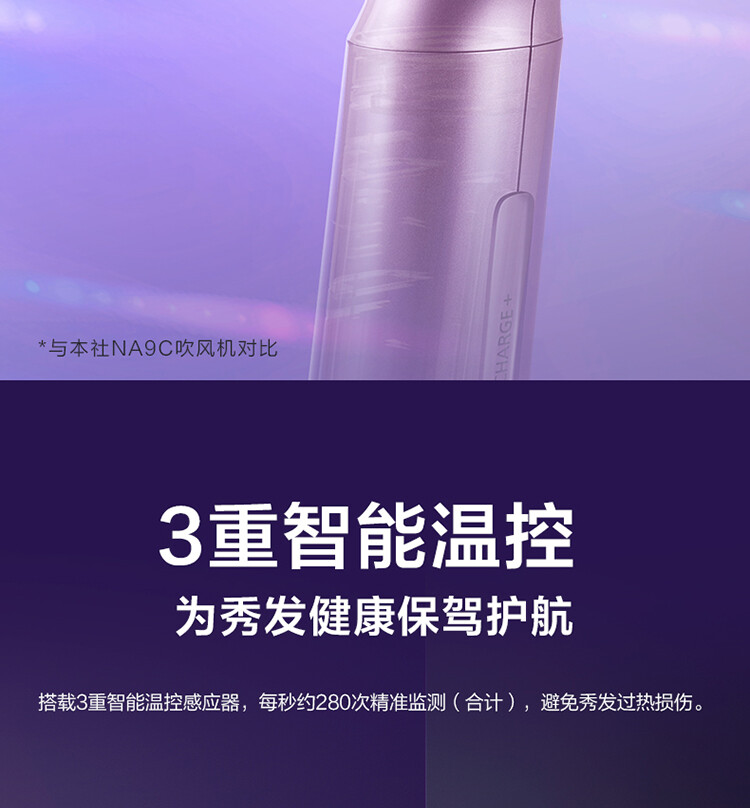 搭載 3 重智能溫控感應器,每秒約 280 次精準監測(合計),避免秀髮過熱損傷。