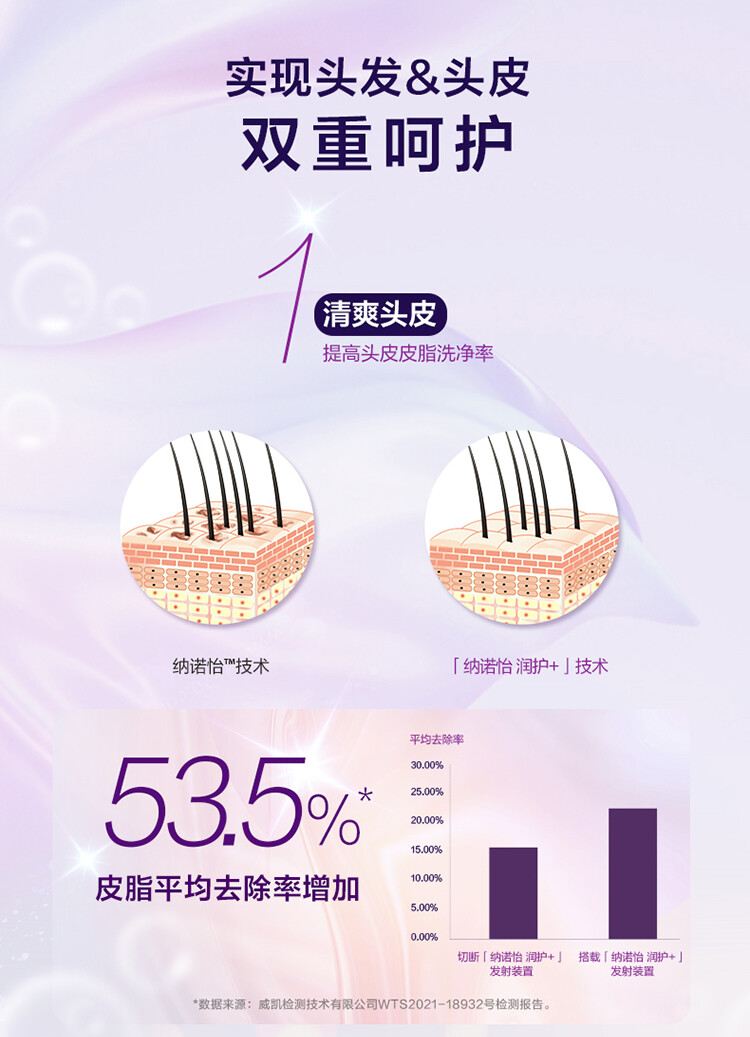1. 清爽頭皮,提高頭皮皮脂洗淨率 - 相對於 納諾怡™技術,「納諾怡潤護+」技術的皮脂平均去除率增加 53.5%。