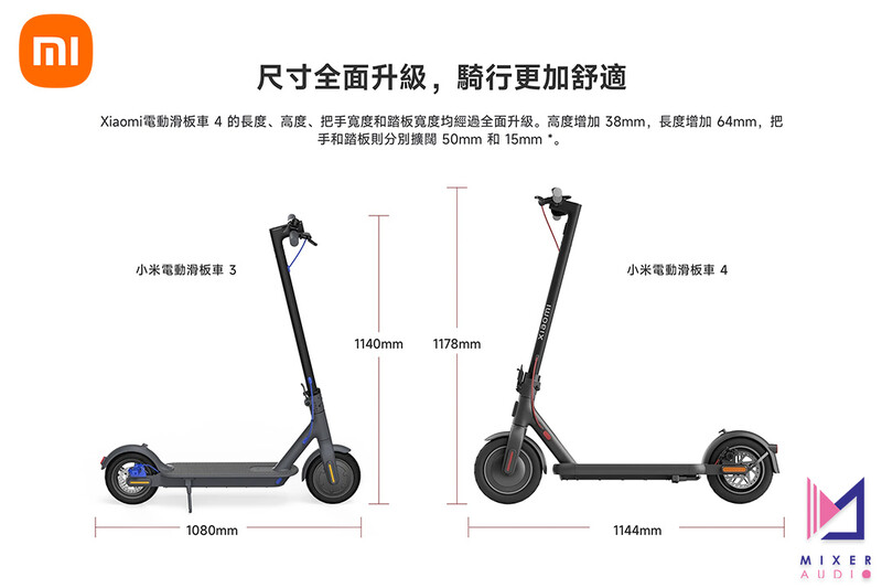 Xiaomi 電動滑板車 4 的長度、高度、把手寬度和踏板寬度均經過全面升級。高度增加 38mm,長度增加 64mm,把手和踏板則分別擴闊 50mm 和 15mm。