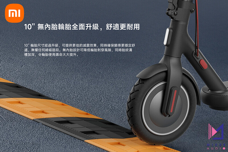 10'' 輪胎尺寸經過升級,可提供更佳的減震效果,同時確保騎乘更穩定舒適,無懼任何崎嶇路段。無內胎設計可降低輪胎刺穿風險,同時胎紋溝槽加深,令輪胎使用壽命大大提升。