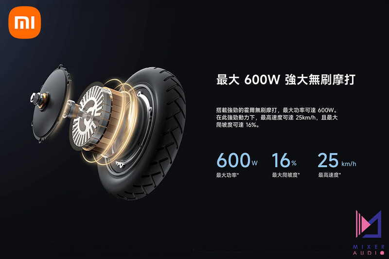 搭載強勁的霍爾無刷摩打,最大功率可達 600W。在此強勁動力下,最高速度可達 25km/h,且最大爬坡度可達 16%。