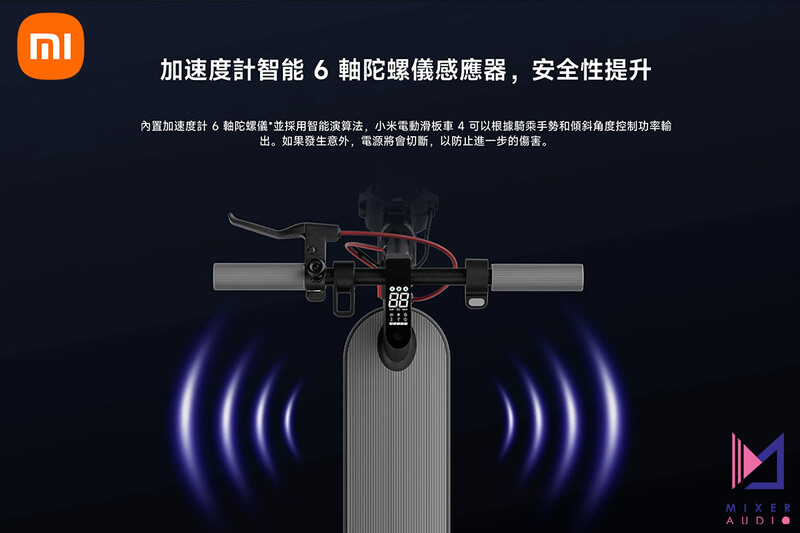 內置加速度計 6 軸陀螺儀並採用智能演算法,小米電動滑板車 4 可以根據騎乘手勢和傾斜角度控制功率輸出。如果發生意外,電源將會切斷,以防止進一步的傷害。
