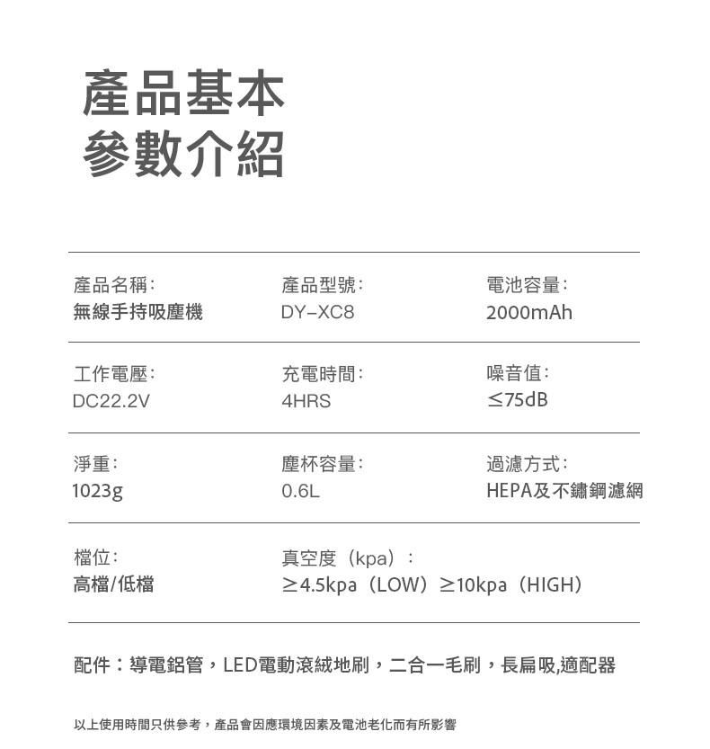・2000mAh 鋰電池,充滿電後可連續使用約 18-40 分鐘