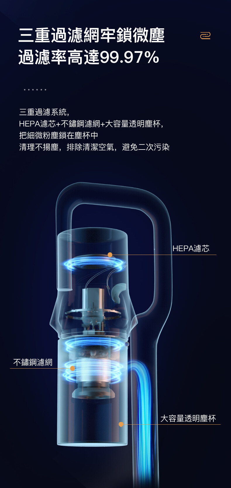 ・F9 等級 HEPA 濾芯 + 不鏽鋼濾網 + 大容量透明塵杯,多重過濾系統,吸塵無微不至