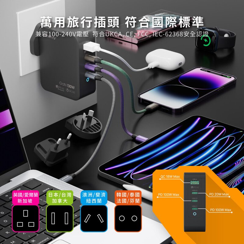 ・附 3 個旅行充電頭,韓 / 泰 / 澳 / 紐 / 台 / 日 / 星 / 馬,全球通用