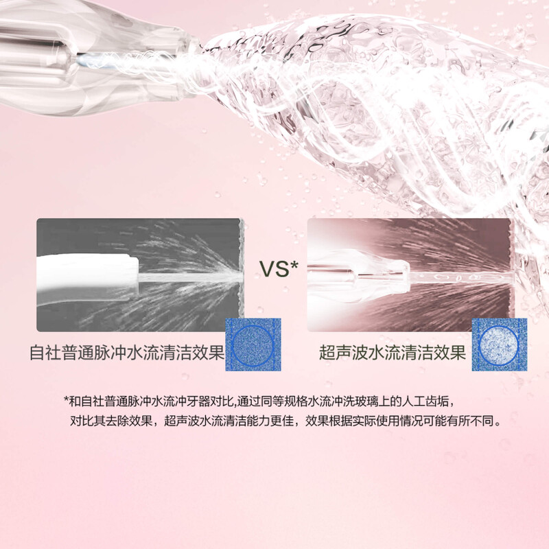和普通脈衝水流水牙線對比,透過同等規格水流沖洗玻璃上的人工齒垢,對比其去除效果,超音波水流清潔能力更佳。