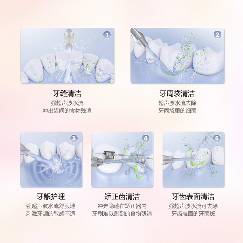 5. 牙齒表面清潔:強烈超音波水流可去除牙齒表面的牙菌斑