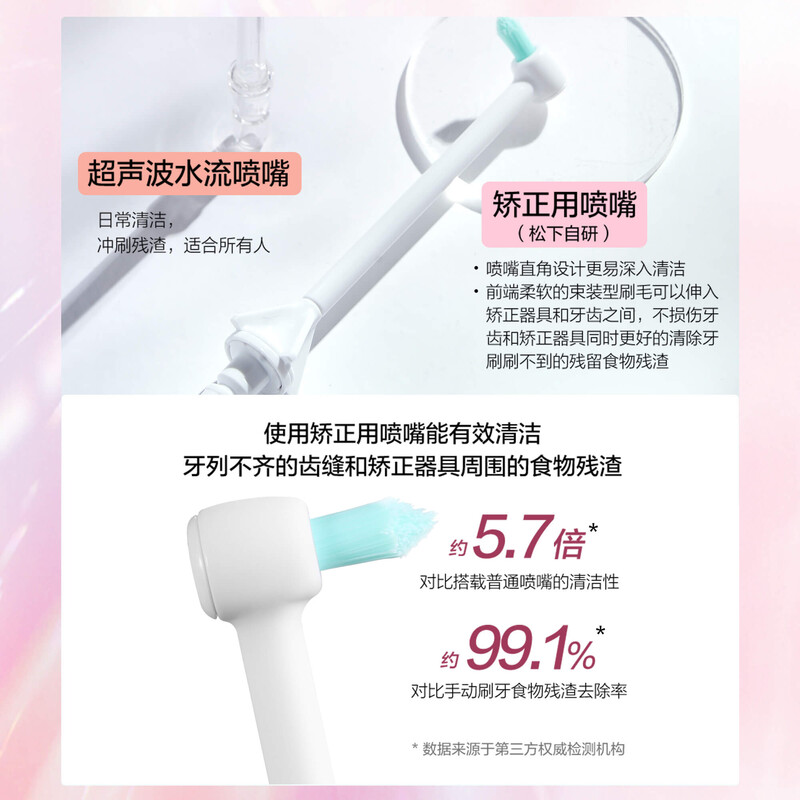 矯正用噴嘴 - 噴嘴直角設計更容易深入清潔,前端柔軟的束裝型刷毛可以伸入矯正器具和牙齒之間,不損傷牙齒和矯正器具同時更好的清除牙刷刷不到的殘留食物殘渣。