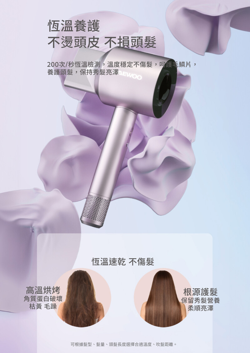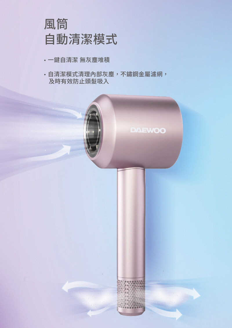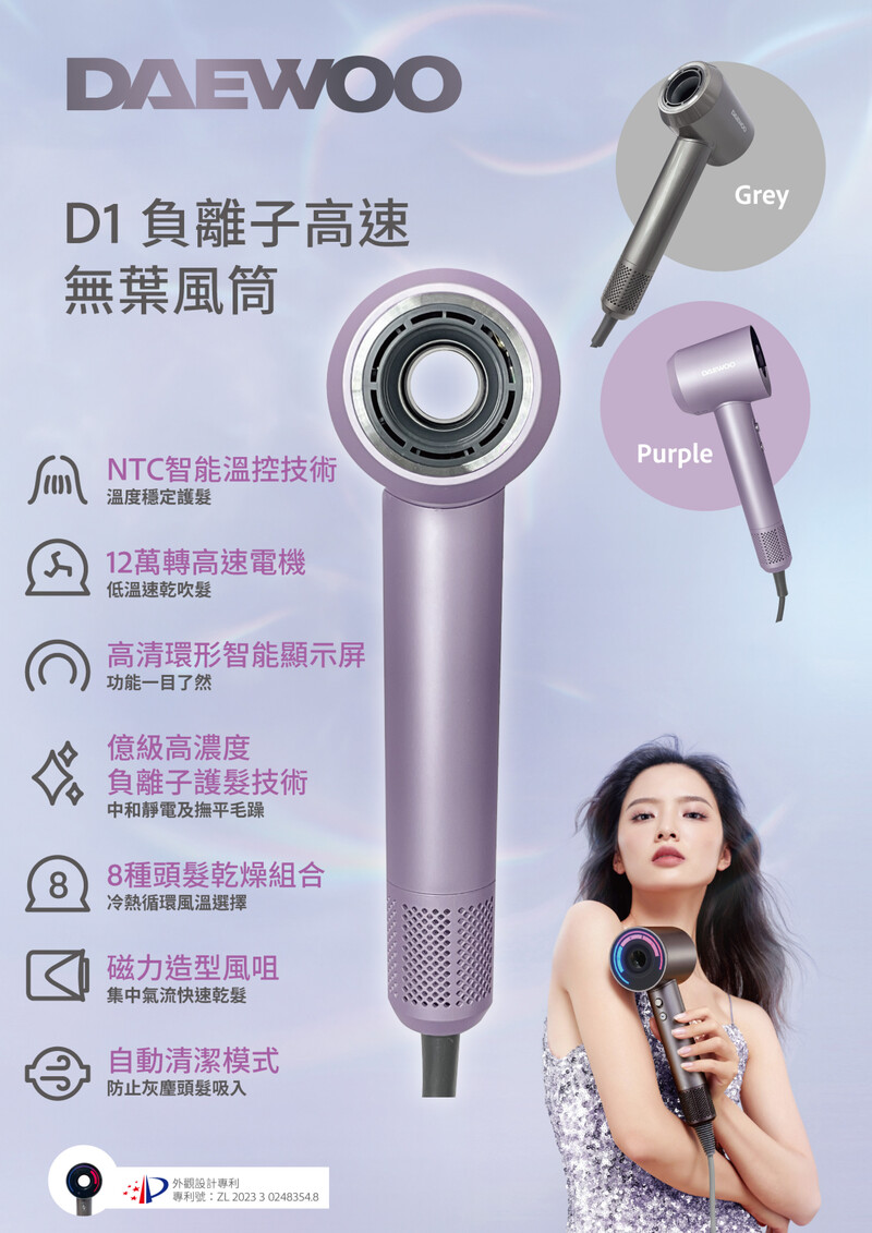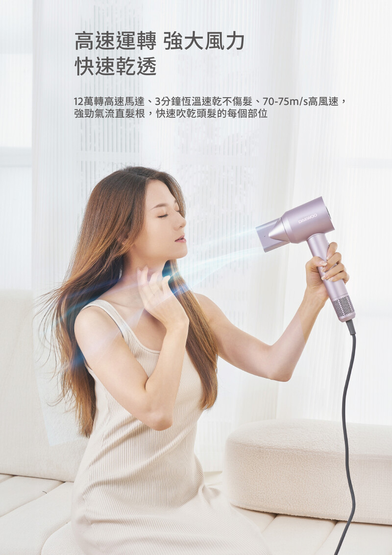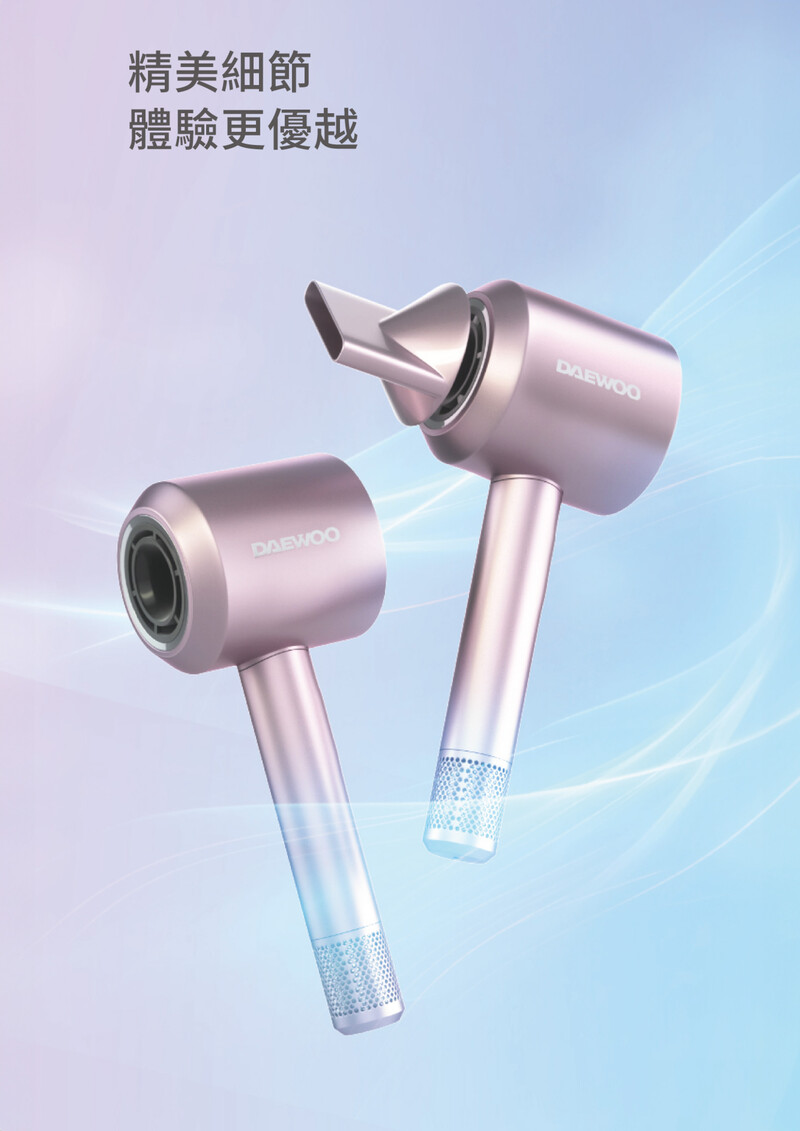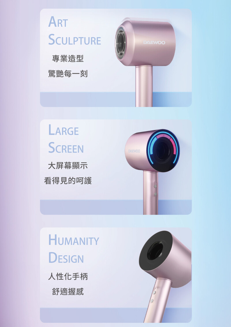 韓國大宇最新推出的負離子高速無葉風筒,獨創高清環形智能顯示屏,備有冷風、溫風、熱風、冷溫循環四種風溫模式,高風速及低風速共 8 種操作模式,產品採用無葉中空設計,12 萬轉無刷電機,風速每秒達 70-75m/s,加上 NTC 恆溫技術及億級負離子釋出,速乾同時護髮。專業型格外型設計,絕對是市場性價比之選。