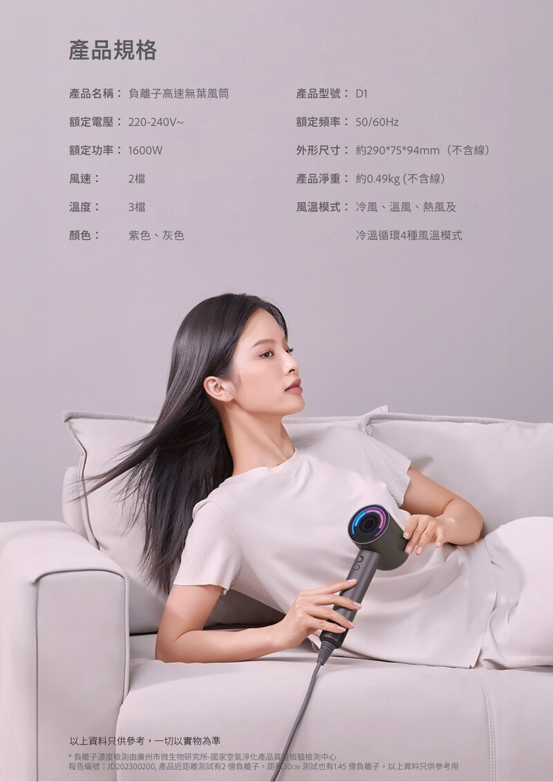 釋放億級高濃度負離子護髮技術,風筒最高釋出 2 億高濃度負離子,有效中和靜電,形成鎖水膜,柔順髮絲、撫平毛躁及收緊毛鱗片,令頭髮更持久順滑,吹髪更護髮。