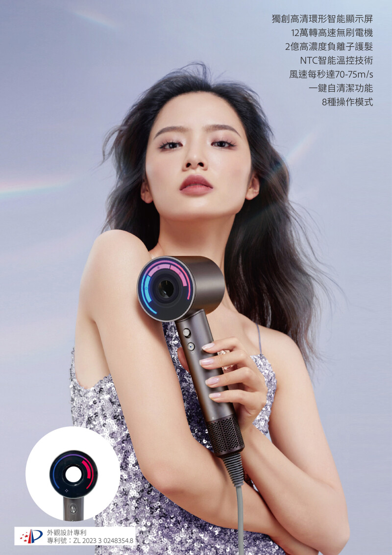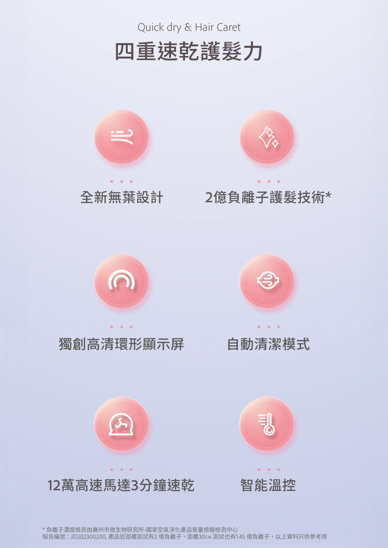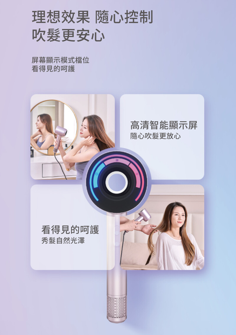 全新無葉設計|2億負離子護髮技術|獨創高清環形顯示屏|自動清潔模式|12萬高速馬達3分鐘速乾|智能溫控