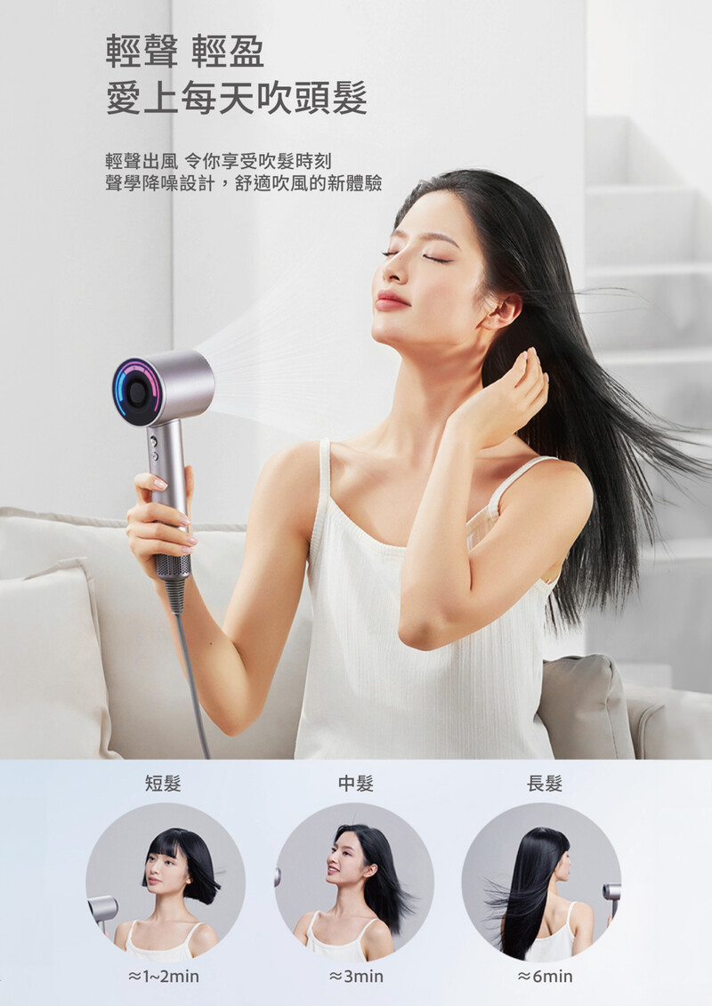 輕聲出風,令你享受吹髮時刻。聲學降噪設計,舒適吹風的新體驗。