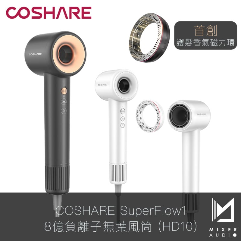 無需再以高溫乾髮令頭髮乾旱開叉。COSHARE SuperFlow1 高速負離子無葉風筒透過智能溫控系統及 8 億負離子保護頭髮免受熱損傷,透過首創的精華環為頭髮注入營養,提供十多種造型選項。在保持體積小巧同時,確保操作寧靜。