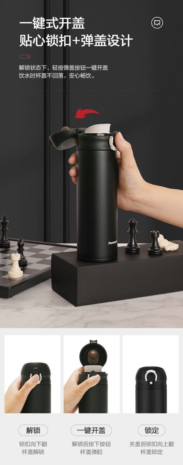 解鎖狀態下,輕按彈蓋按鈕一鍵開蓋;飲水時杯蓋不回落,安心暢飲。