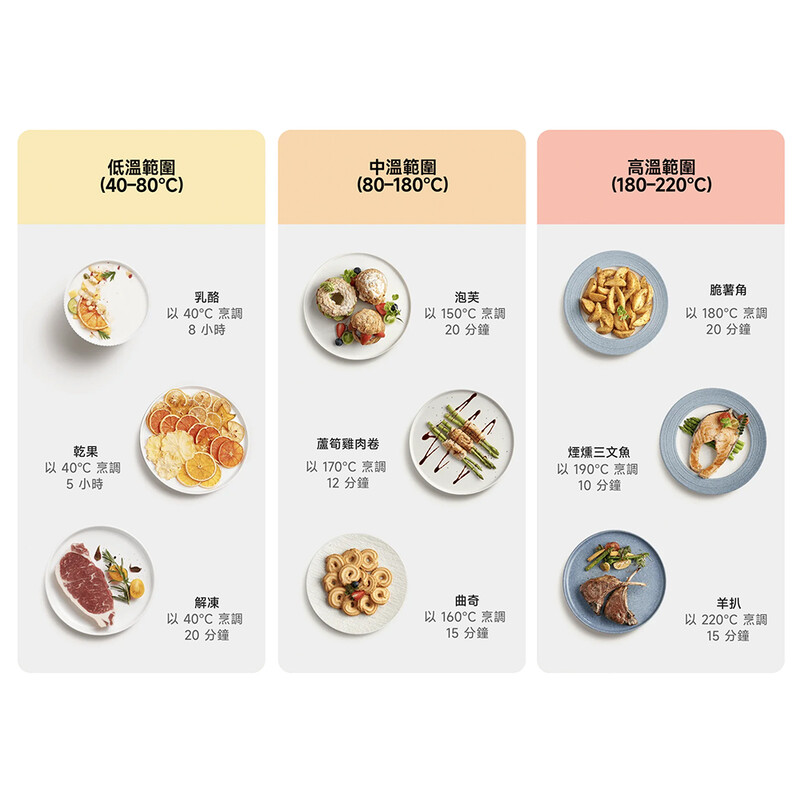 內置 NTC 智能溫度控制技術,可在烹調期間精準監控溫度,避免食物燒焦和未熟透。溫度最低 40°C,可以保持解凍、發酵及乾果所需恆溫。溫度最高 220°C,烘烤、煎炸、烤焗樣樣精通。