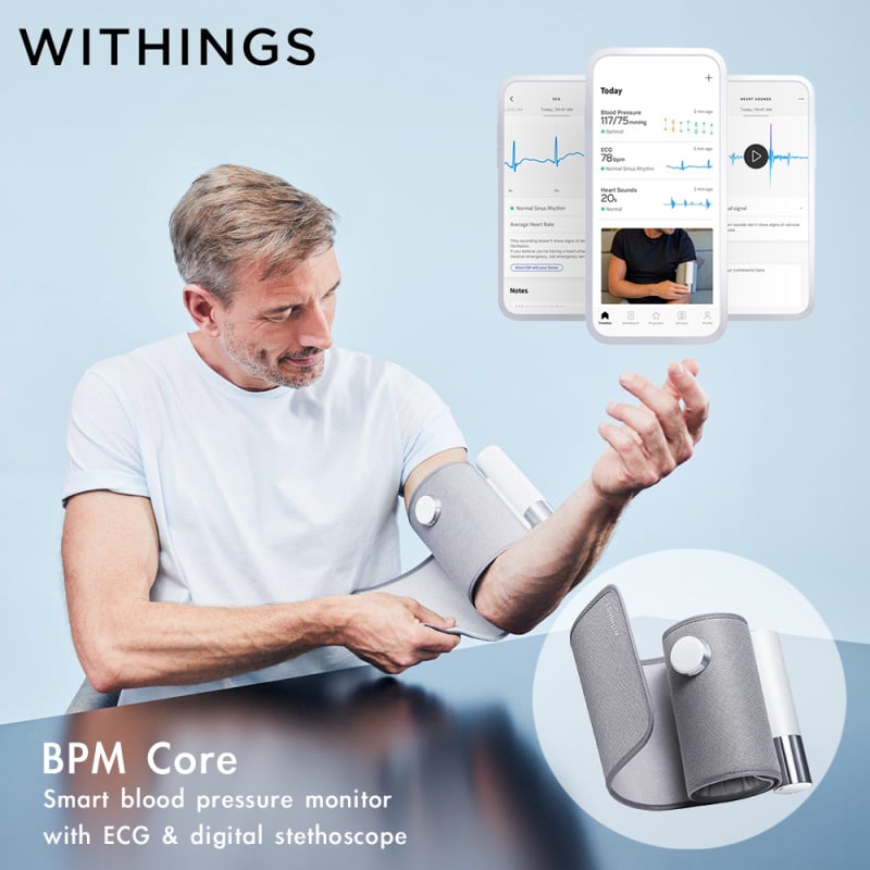 Withings BPM Core 是全球首款,集心電圖與數字聽診器於一體的血壓計。BPM Core 不僅是一台高度精準的智能血壓計和心率監測器,內置的數字聽診器,讓您在舒適的家中檢測常見心臟瓣膜疾病和心房顫動的徵兆。除了血壓和心率監測外,這款三合一設備還可以記錄心電圖(ECG)、檢測心房纖維顫動 (AFib),心血管疾病存在嚴重的心律不整。用戶只需90秒即可在設備上直接查看彩色反饋報告,並通過Wi-Fi或藍牙連接在免費的Withings應用程序中查看完整的歷史記錄,輕鬆與醫生共享數據。最多可識別8個用戶,一機足夠一家人共享,長達6個月的電池壽命,可通過USB線進行充電。榮獲歐盟醫療CE認證(ECG 功能),香港原裝行貨,兩年保養。