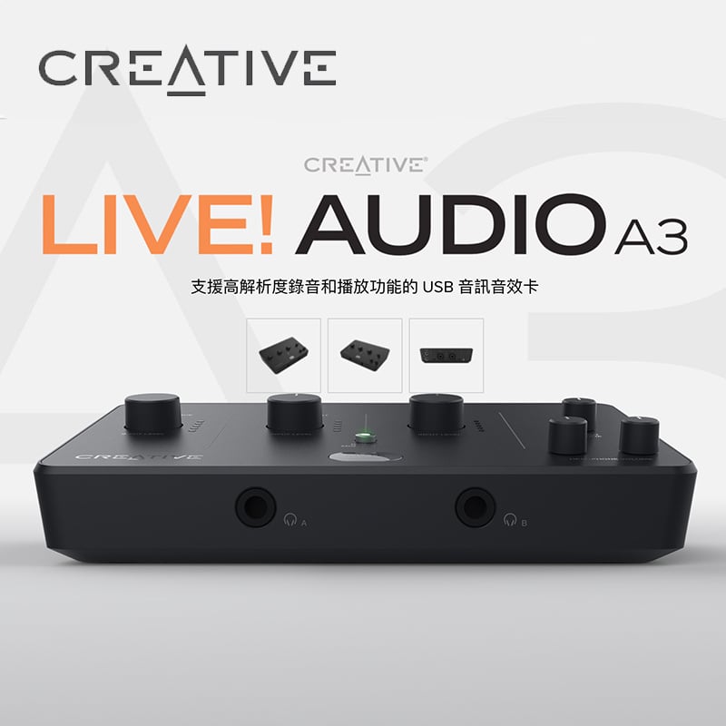 利用全新的 Creative Live! Audio A3 USB 音訊音效卡,釋放您的創作潛能!Creative Live! Audio A3 以 24 位元 / 96 kHz 驚人的音訊和眾多便捷的多功能性而設計,是您邁向專業級音訊錄製、播放和混音道路上的利器,所有這些都可在您自己的創作空間中舒適地進行。