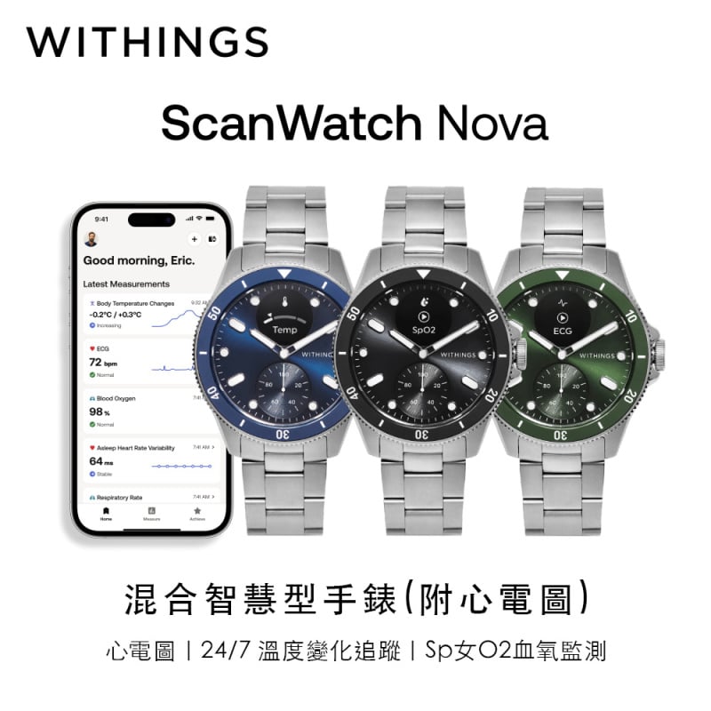 ScanWatch Nova薈聚了超過10年的全天候全面追蹤經驗,為用戶提供最精確的手錶體驗和應用程式內 互動。作為我們混合型高階智慧手錶的最新一代產品,採用了升級後的HealthSenseTM系統和先進的感 測器,以提供更豐富的指標和更高的準確度。