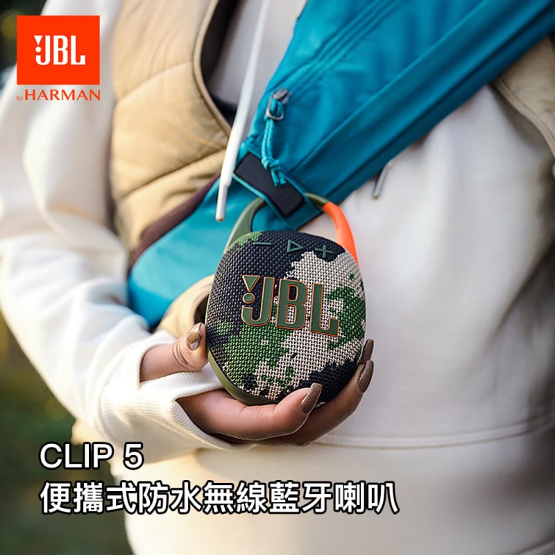 JBL Clip 5 喇叭採用消費後回收塑膠和布料製成喇叭網格。它還以 FSC 認證的大豆油墨印刷紙張包裝。