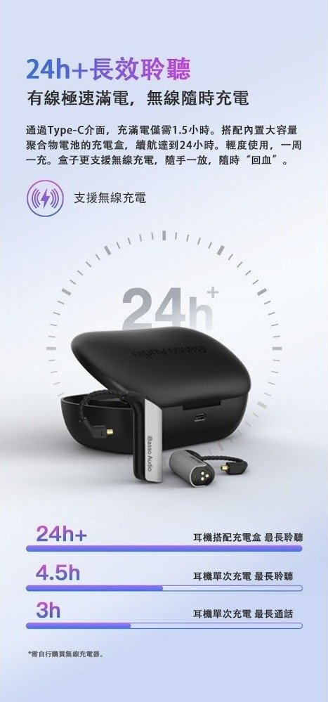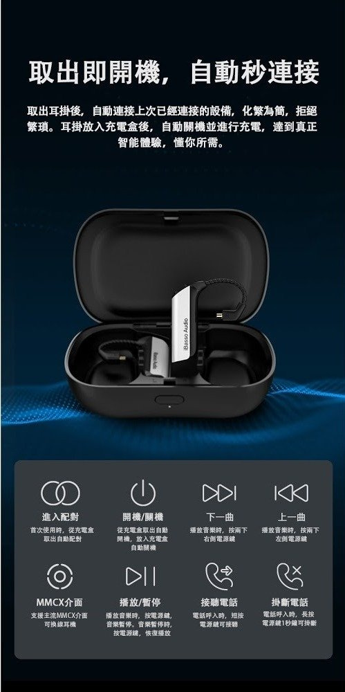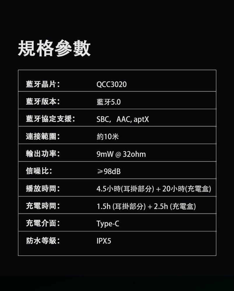 播放時間:4.5 小時(耳掛部分)+ 20 小時(充電盒)