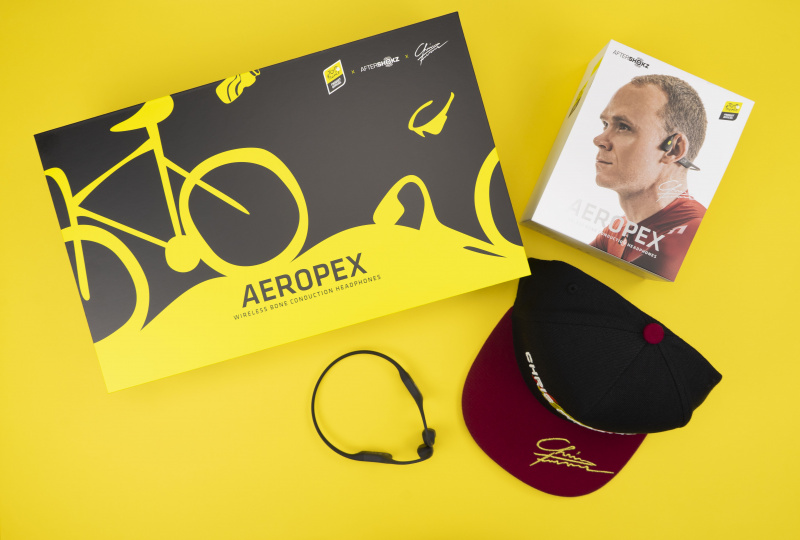 AfterShokz × Tour de France 環法限量版Aeropex聯乘套裝的設計靈感來源於環法單車賽(Tour de France)的標誌配色與極具有代表性與標誌性的「黃色戰衣」,不論是外包裝的禮盒、棒球帽、耳機外盒及耳機都採用了黑夾「環法黃」作配色。而今次聯乘套裝的內會有一盒環法限量版的AfterShokz骨傳導藍牙運動耳機 Aeropex,以及一頂Chris Froome簽名刺繡特別版棒球帽。