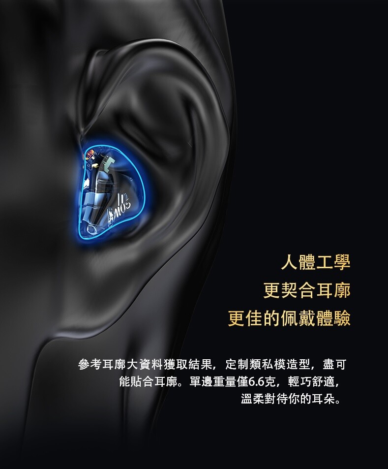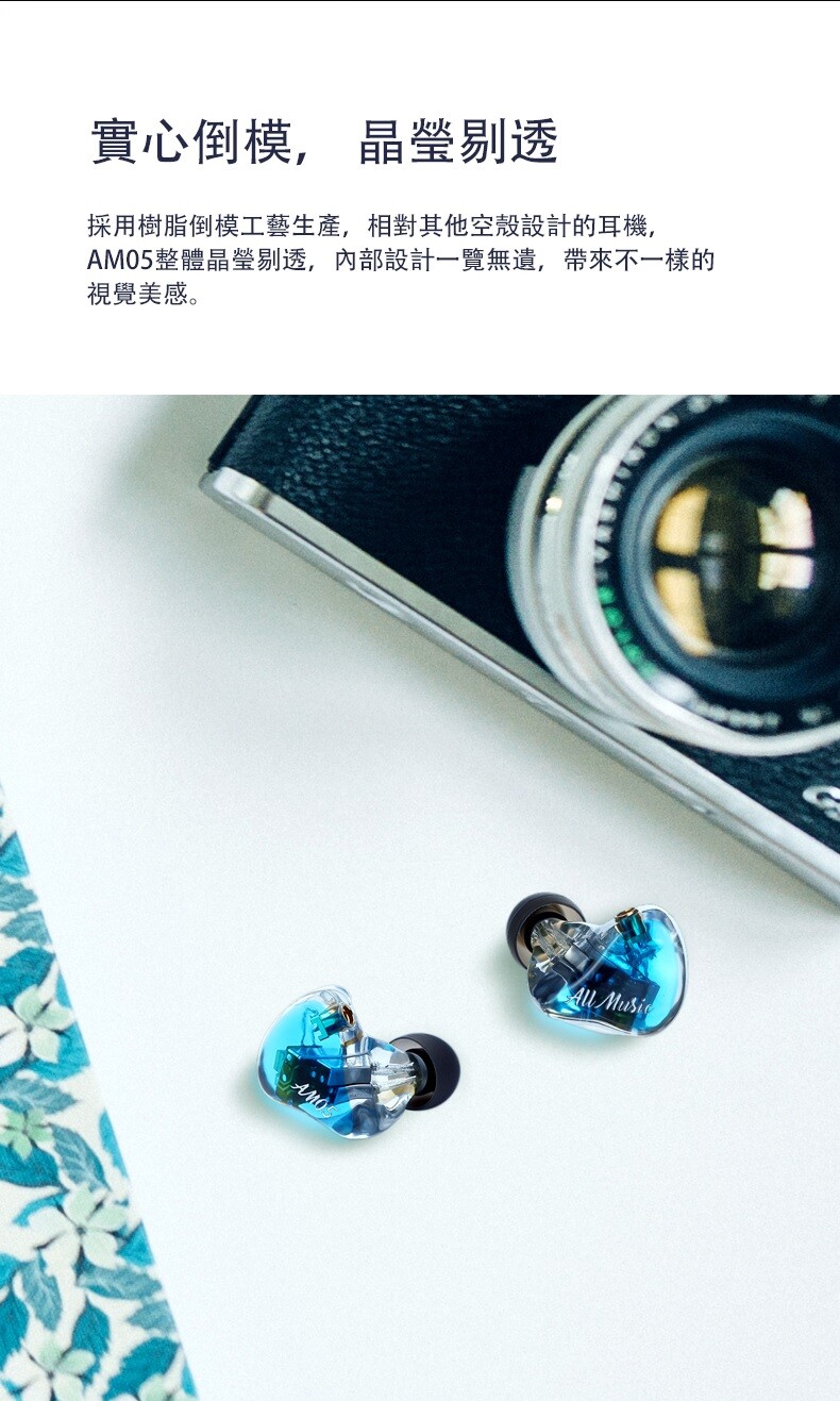 - AM05 的另一大特色是採用實心倒模,以樹脂材料倒模製作出實心耳機殼,比一般常見的空心機殼擁有更為晶透的視覺質感,還能仔細觀察內部設計用料。此外,耳機外殼的造型是參考耳廓形狀大數據採集結果,打造出類客製化耳機的外型,盡可能符合多數消費者的耳廓形狀,提供更貼合舒適的配戴感,單邊重量僅 6.6 公克。