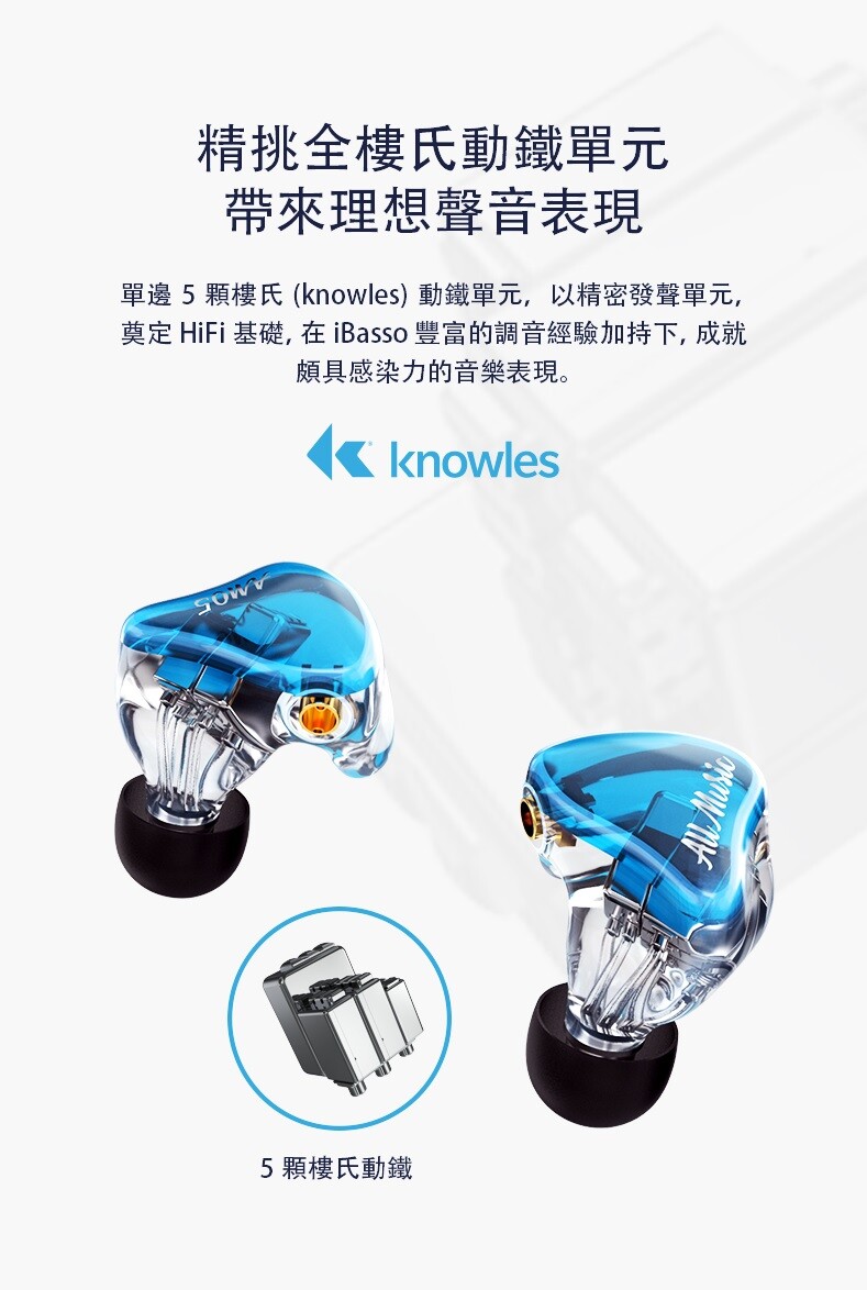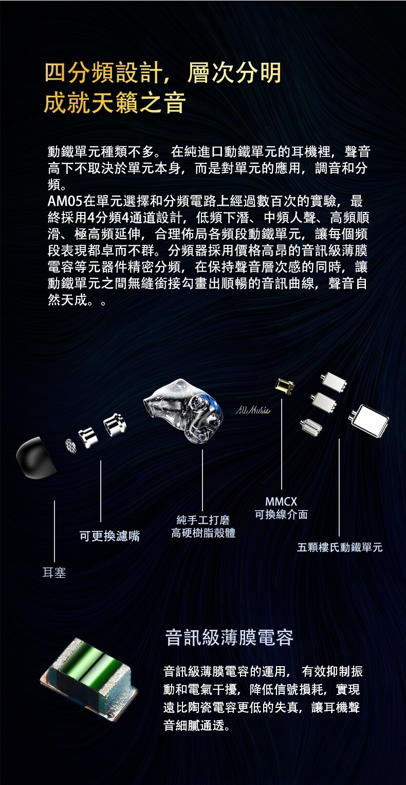 - iBasso推出了新一代類客製耳道耳機 AM05,一口氣搭載了5顆平衡電樞單體,全數使用 Knowles 樓式的製品,輔以自家調音經驗與分頻設計,經過了數百次的實驗之後,最終定案採用四路分音設計。原廠強調,AM05 的分音線路中運用了成本較高的音響級薄膜電容,能夠抑制振動與電氣干擾,降低訊號損耗,比陶瓷電容擁有更低的失真。