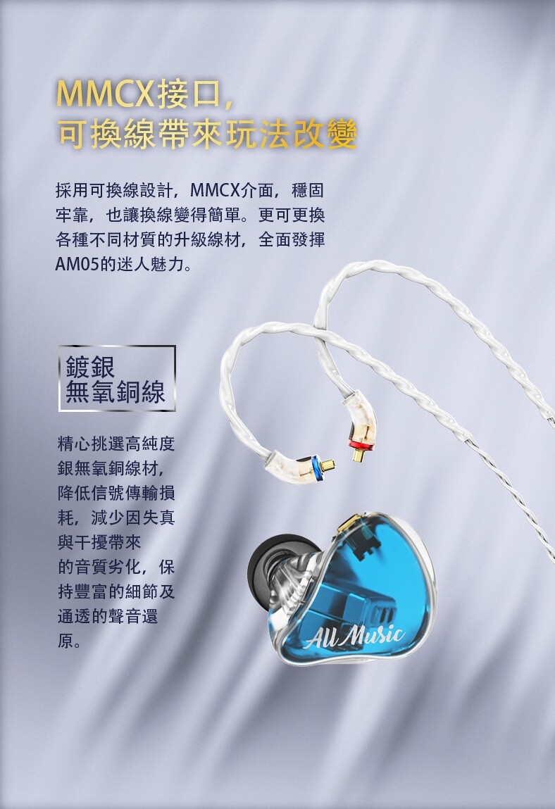 - 耳機線材部分,AM05 選用高純度無氧銅鍍銀導線,降低訊號耗損,保留音樂細節。端子採用 2.5mm 平衡,但是原廠隨附了一條 2.5mm to 3.5mm 短線方便用家轉接,另外,線材為可拆卸設計的MMCX端子,讓用家自由搭配各種不同耳機發燒線材。