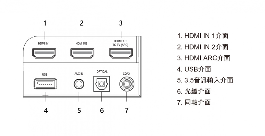 輸入模式:BT / HDMI / AUX/ 光纖 /同軸 / USB