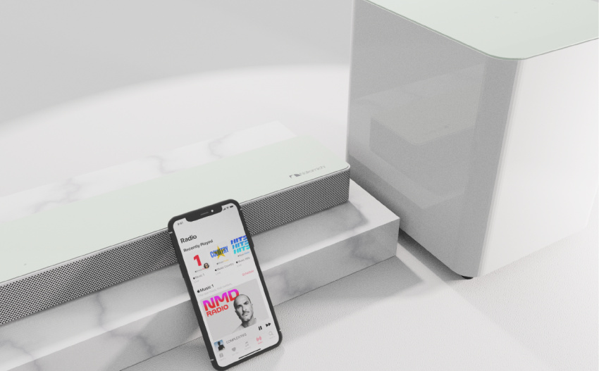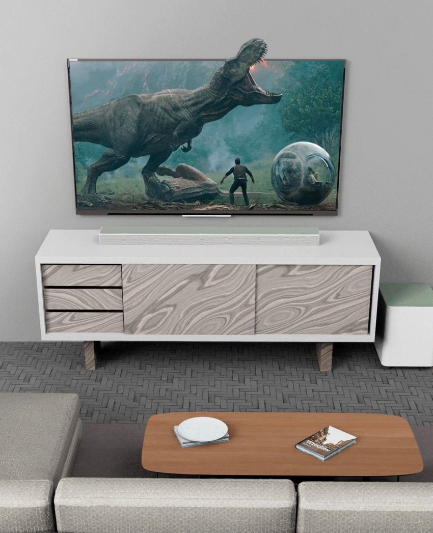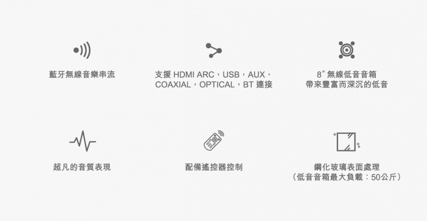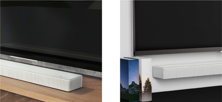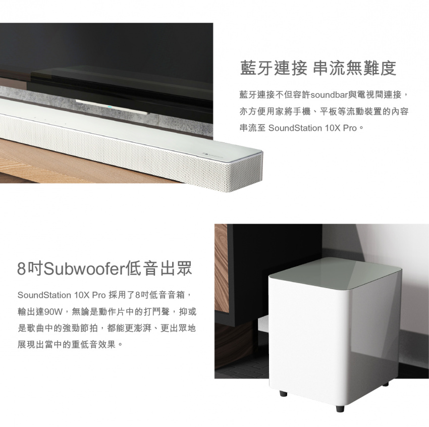 機身採用全白色設計,輔以強化玻璃表面及包覆金屬網罩,與眾不同的造型,為你的家居增添獨特美感;而soundbar與subwoofer間以無線連接,既節省了擺放空間,又減低了安放subwoofer的難度。