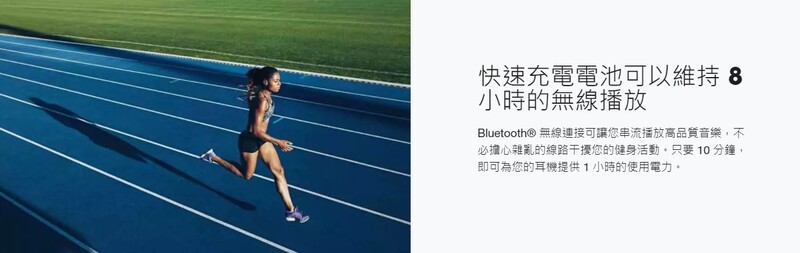 Bluetooth® 無線連接可讓您串流播放高品質音樂,不必擔心雜亂的線路干擾您的健身活動。只要 10 分鐘,即可為您的耳機提供 1 小時的使用電力。