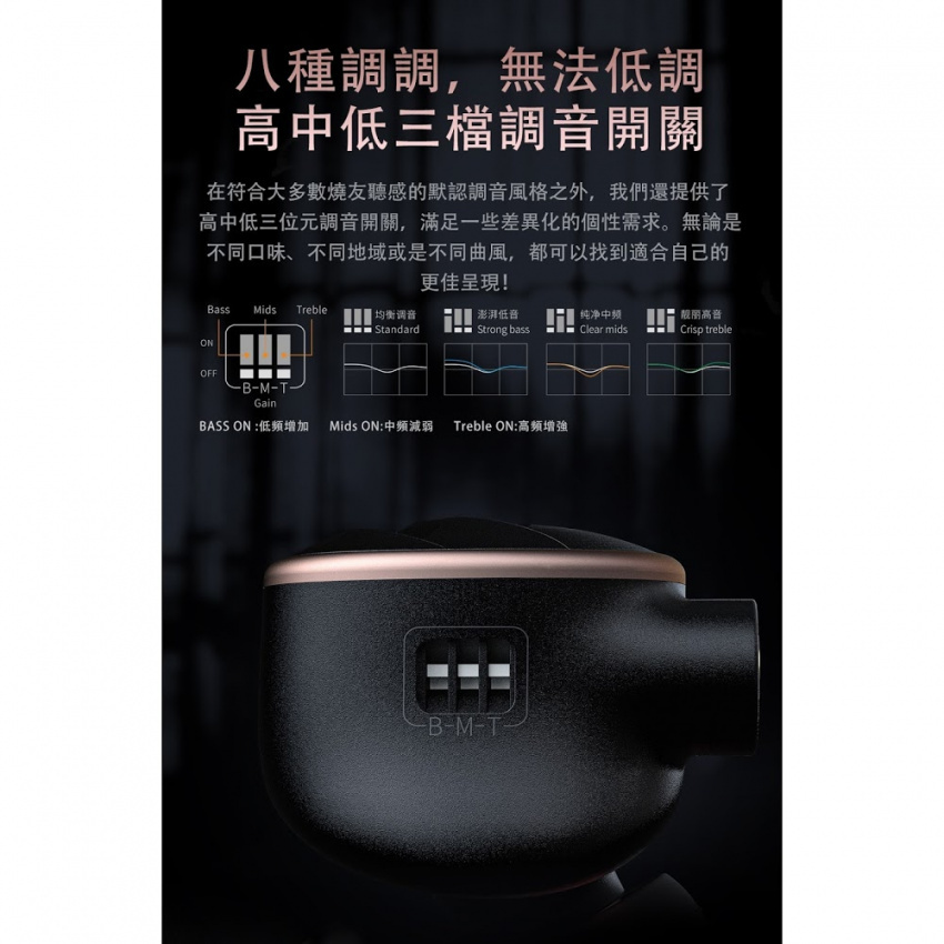 具有高中低三檔調音開關,可以自行切換調音模式,滿足你的聽音喜好。