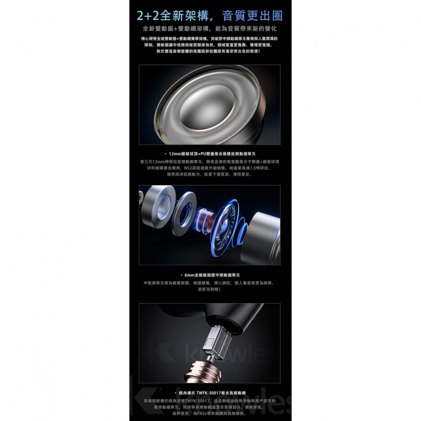 FH5s採用全新研發的雙動圈+雙動鐵聲學架構,