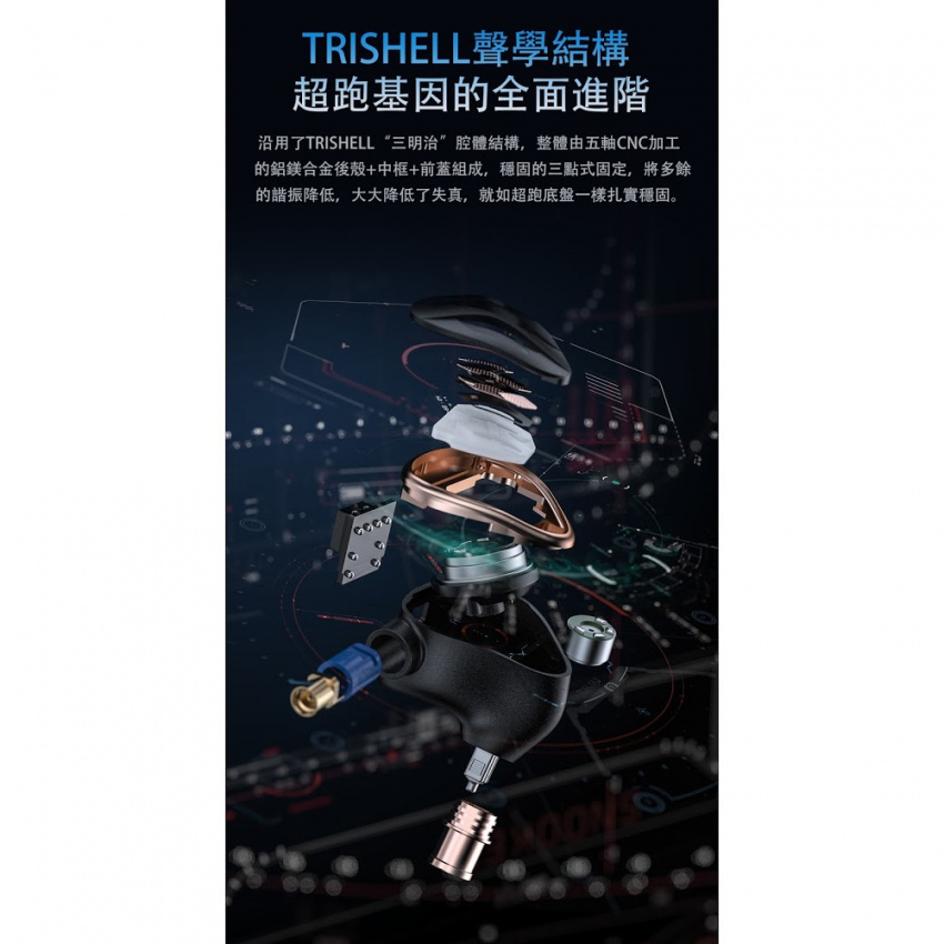聲學結構採用TRISHELL專利技術,由金屬加工的鋁鎂合金組成,