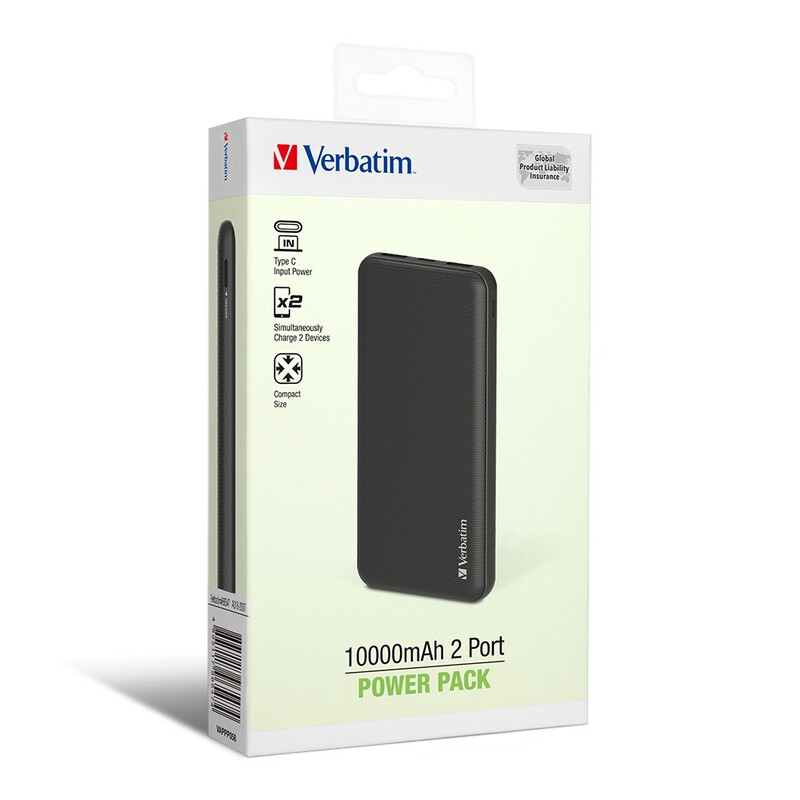- Verbatim 10000mAh行動電源配備2個USB-A端口,能同時為兩台設備充電。每個端口共用5Vdc/2.4A,合共最大輸出12W。
