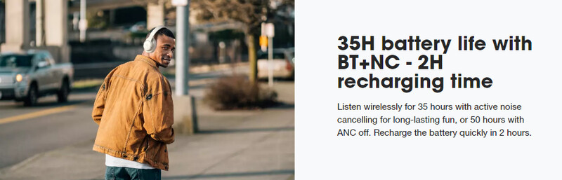 這款無線耳機在開啟主動降噪功能時的續航時間為 35 小時,關閉主動降噪功能時的續航時間為 50 小時. 2 小時內快速充滿電池。