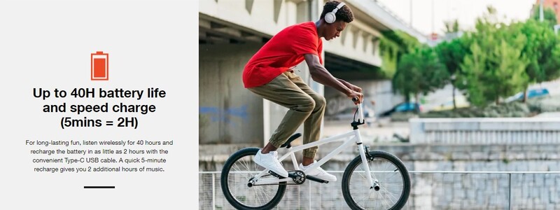 無需凌亂的電源線,即可從您的手機無線傳輸高品質的聲音。電池續航力長達40小時並擁有快速充電功能(5分鐘= 2H)可無線聆聽40個小時,只需要使用簡單的Type-C USB線,即可在短短2個小時內為電池充飽電。 快速充電5分鐘可為您帶來2個小時的音樂時光。*使用時間,會因為音樂的音量與類型而有所增減。