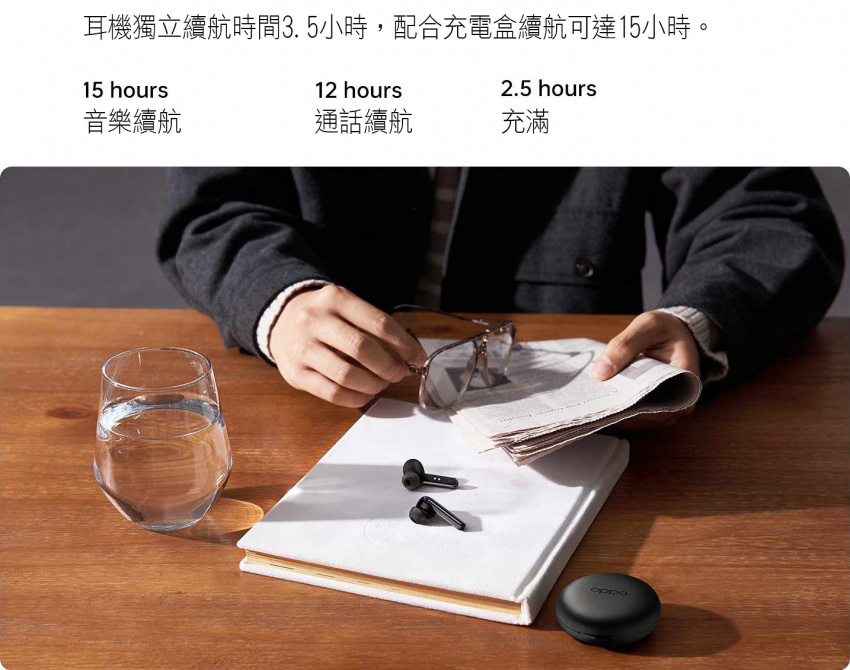- 通話續航時間:耳機2.5hr,耳機+充電盒12hr
