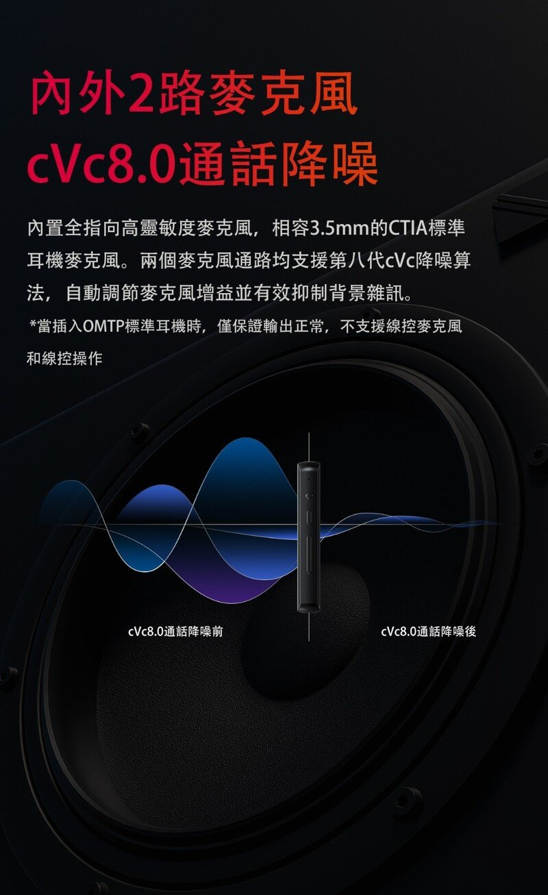 內置高靈敏麥克風,兼容3.5mm的CTIA標準耳機麥克風,並支援cVc通話降噪功能,提供清晰無雜音的通話品質。