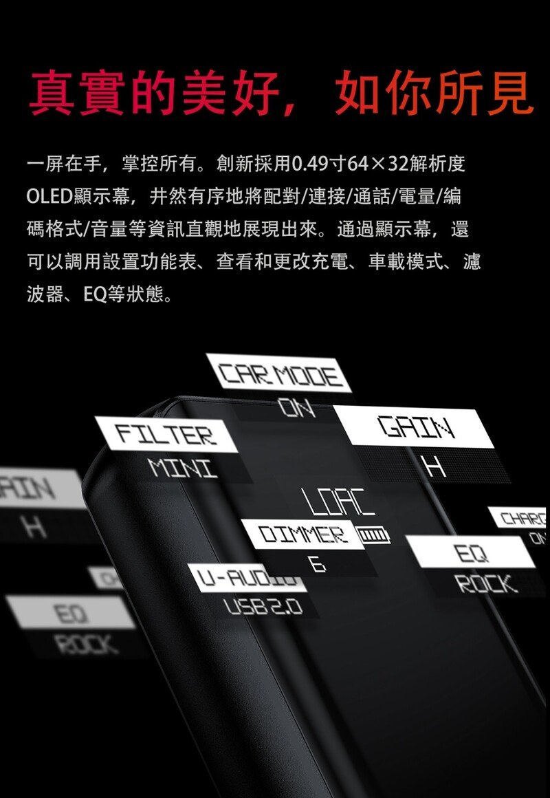 創新採用OLED顯示螢幕,將配對/連接/通話/電量/編碼格式/音量等狀態直接顯示出來,讓你隨時都能一目瞭然。