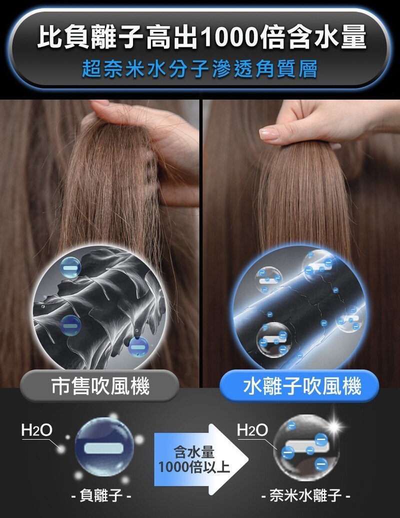 • NamiD1水離子吹風機比普通負離子釋出高出1000倍既含水量,減低吹頭後90%頭髮毛燥既問題,更有助保水護髮、修復毛囊,令到頭髮更加柔軟。